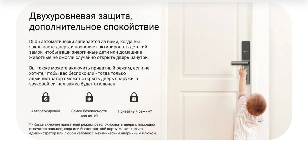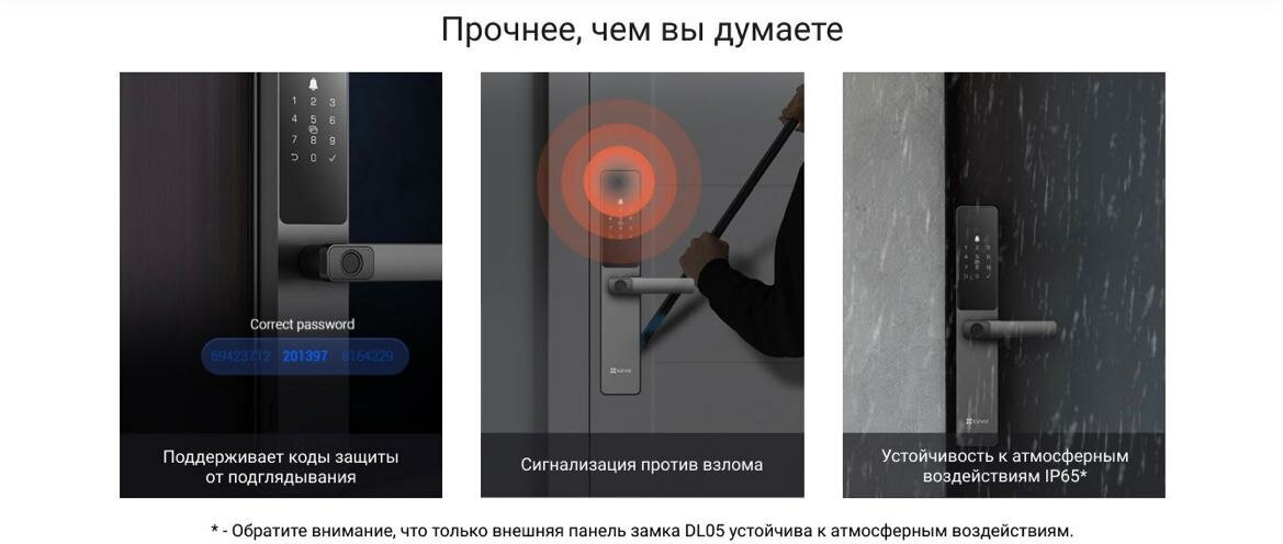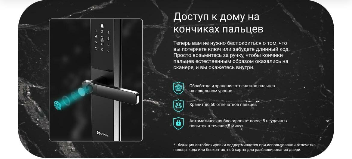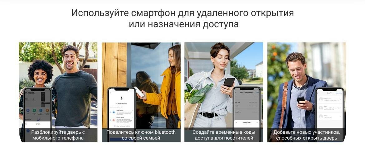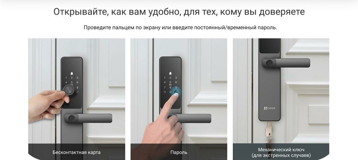 Способы разблокировки - Bluetooth-ключ, Бесконтактная карта, Временные коды, Дистанционная разблокировка, Код доступа, Механический ключ, Отпечаток пальца.